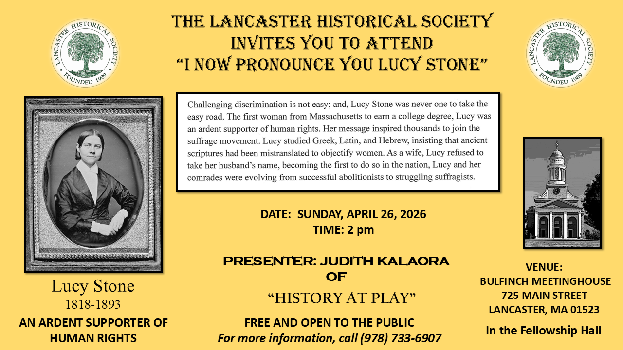 As winter closes out, our next program is scheduled for Sunday April 26. In this presentation of I Now Pronounce You Lucy Stone™, HAP Founder and Artistic Director Judith Kalaora is Lucy Stone: The first woman from Massachusetts to earn a college degree, using her experience and knowledge gained to become a fierce abolitionist and women’s rights activist. You can sign up for this event at EventBrite – CLICK HERE.
